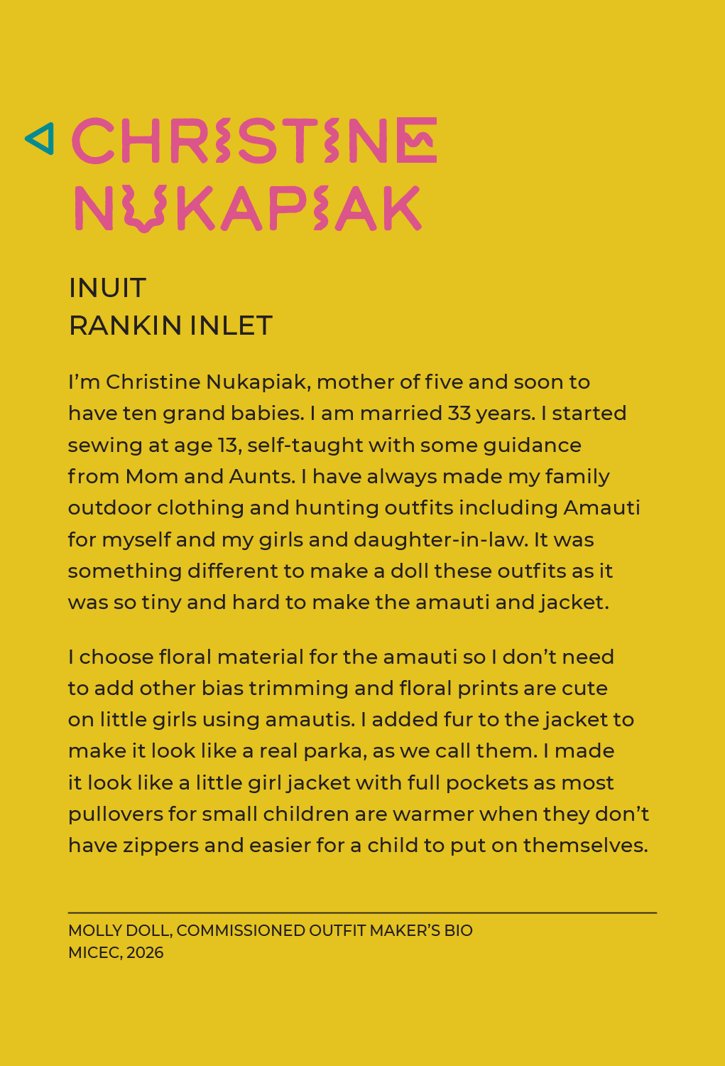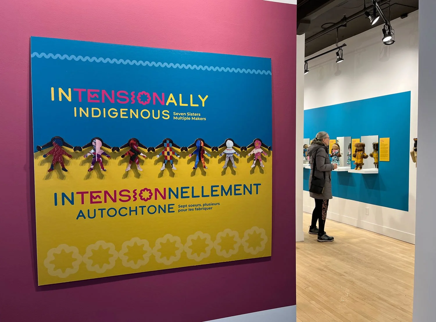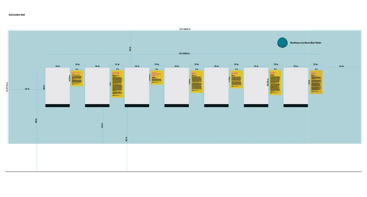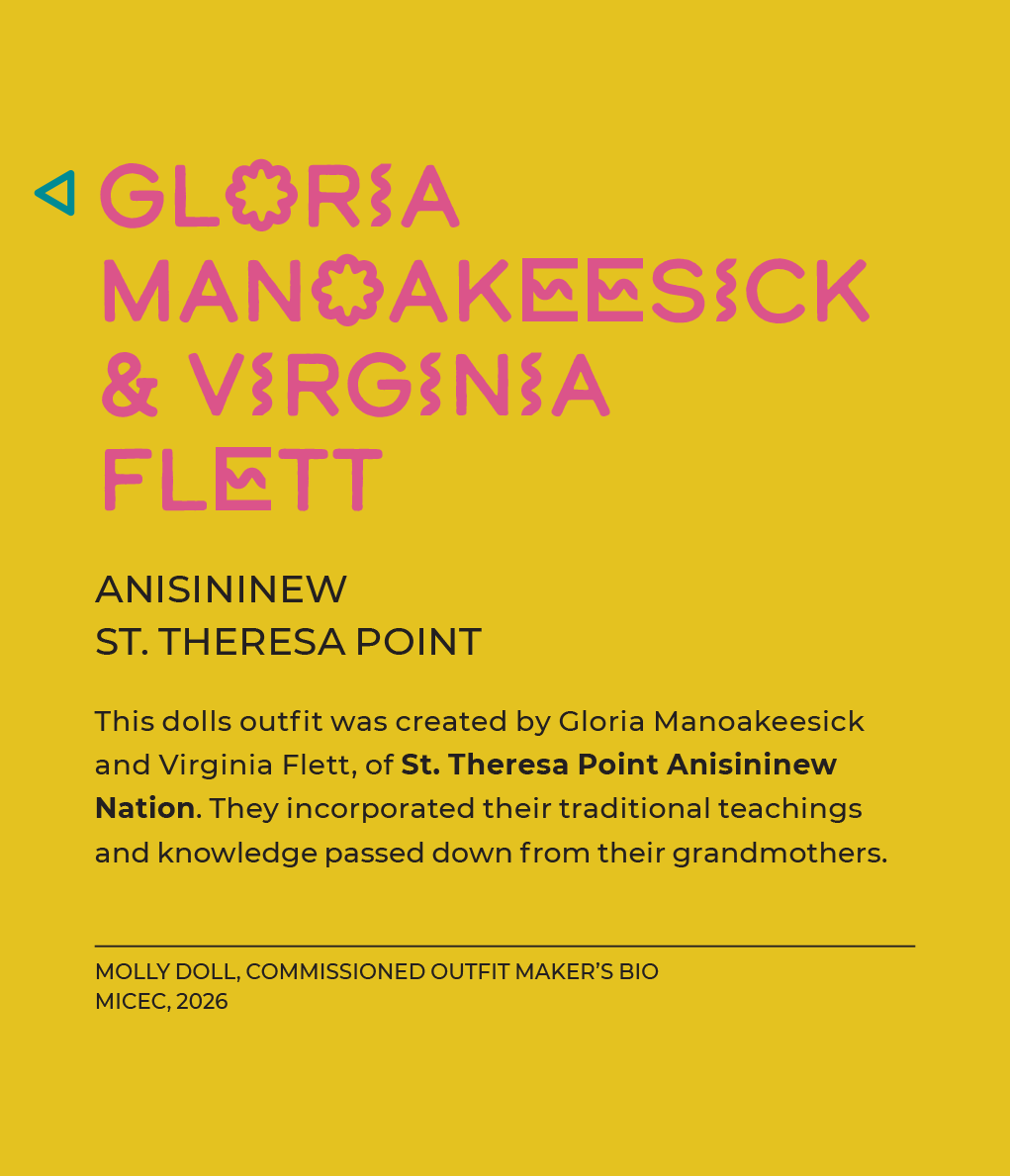 Exhibition, graphic, and promotional design for Intensionally Indigenous: Seven Sisters, Multiple Makers, presented by the Manitoba Indigenous Cultural Education Centre in partnership with the Manitoba Crafts Museum and Library. Developed in collaboration with seven Indigenous makers, the exhibition features newly created garments designed specifically for the Molly Doll, alongside historic dolls from the collections of both organizations. A limited edition of 500 Molly Dolls were produced by the company My Friend Huggles, in partnership with an Indigenous Elders’ and youth sewing circle in Treaty 8 territory, Alberta. For this project, MICEC invited seven makers, one representing each of the Indigenous Nations in Manitoba, to reimagine how Molly would be dressed within their respective cultures. This exhibit is showing until April 23, 2026 at the C2 Centre for Craft. 2026