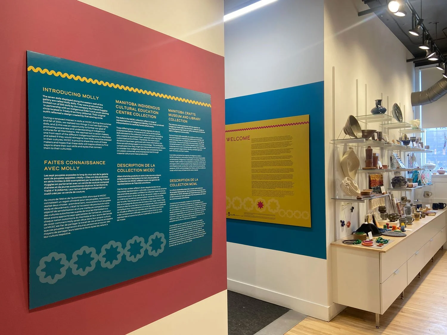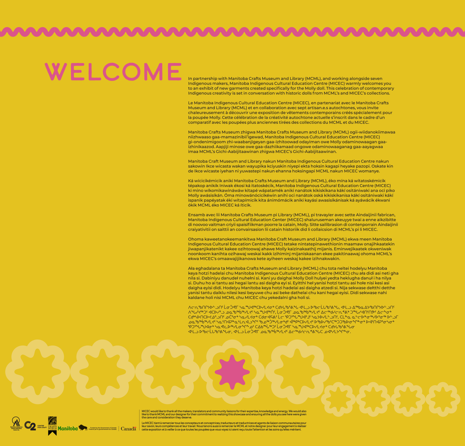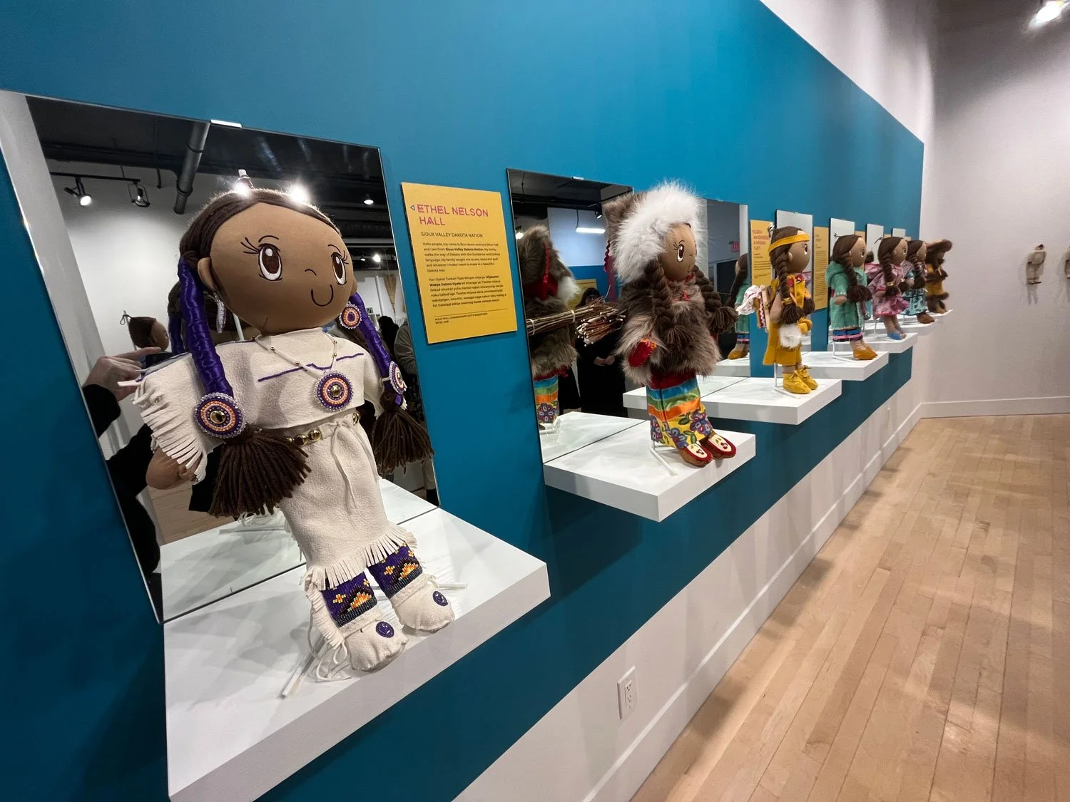 Exhibition, graphic, and promotional design for Intensionally Indigenous: Seven Sisters, Multiple Makers, presented by the Manitoba Indigenous Cultural Education Centre in partnership with the Manitoba Crafts Museum and Library. Developed in collaboration with seven Indigenous makers, the exhibition features newly created garments designed specifically for the Molly Doll, alongside historic dolls from the collections of both organizations. A limited edition of 500 Molly Dolls were produced by the company My Friend Huggles, in partnership with an Indigenous Elders’ and youth sewing circle in Treaty 8 territory, Alberta. For this project, MICEC invited seven makers, one representing each of the Indigenous Nations in Manitoba, to reimagine how Molly would be dressed within their respective cultures. This exhibit is showing until April 23, 2026 at the C2 Centre for Craft. 2026