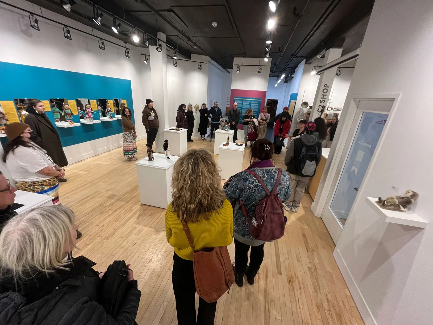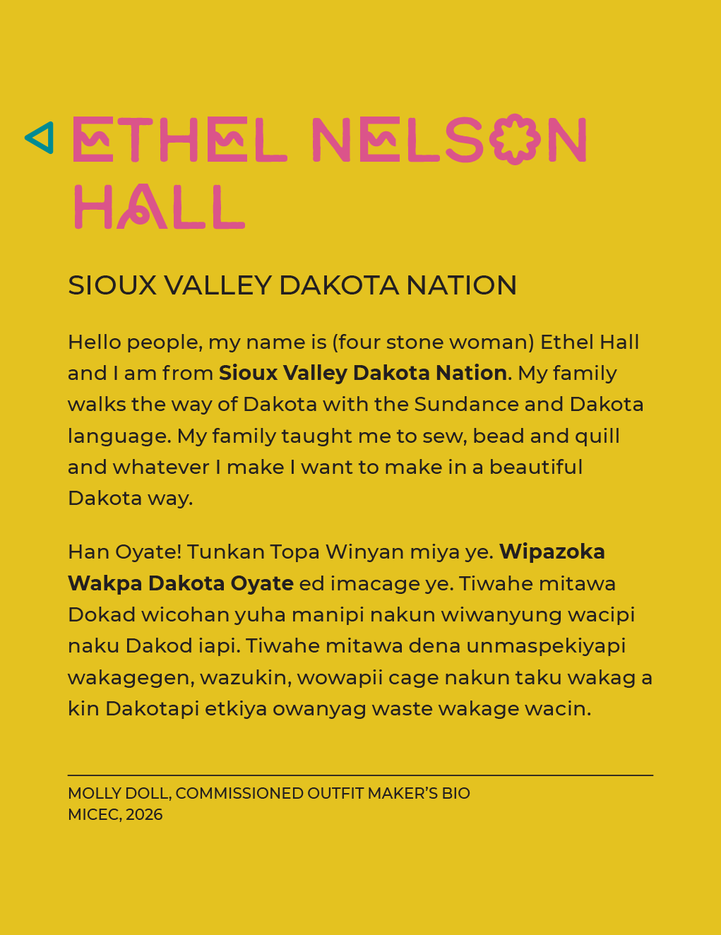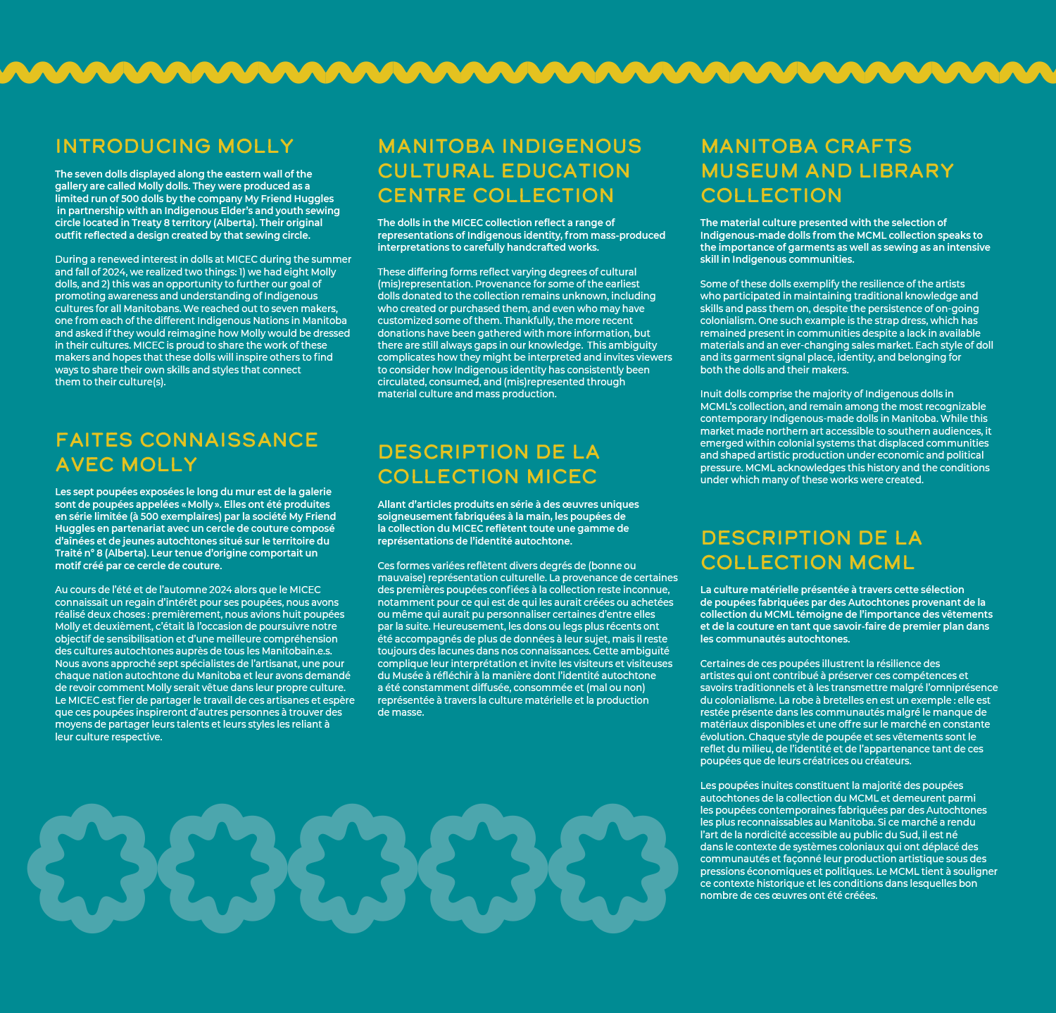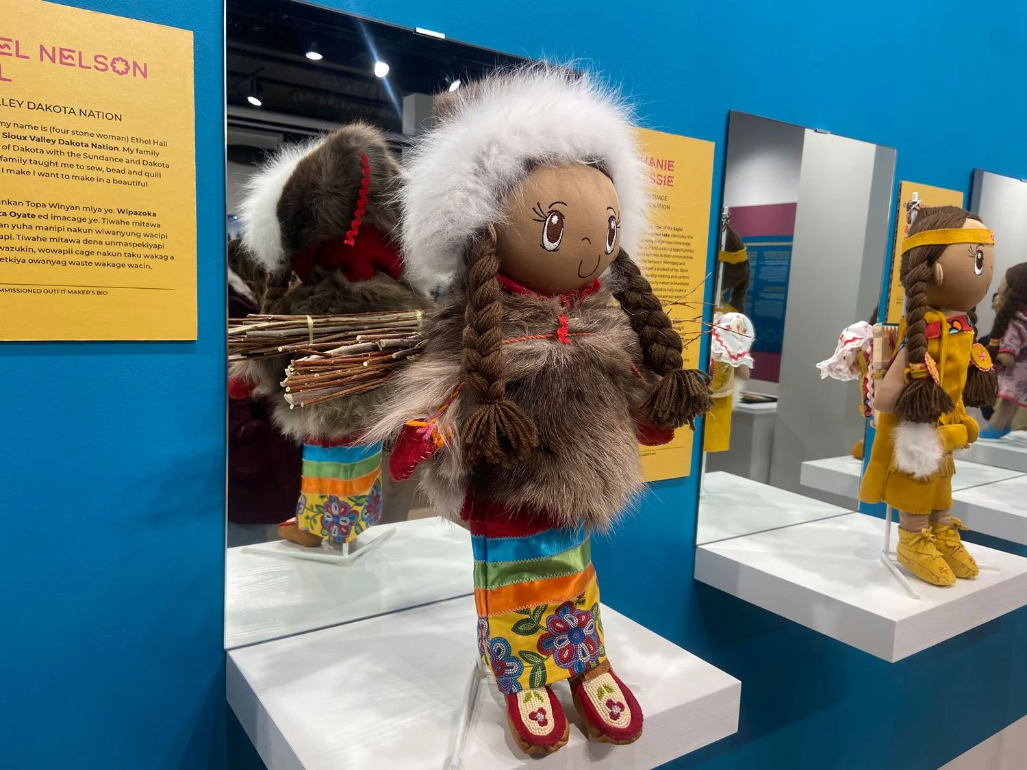 Exhibition, graphic, and promotional design for Intensionally Indigenous: Seven Sisters, Multiple Makers, presented by the Manitoba Indigenous Cultural Education Centre in partnership with the Manitoba Crafts Museum and Library. Developed in collaboration with seven Indigenous makers, the exhibition features newly created garments designed specifically for the Molly Doll, alongside historic dolls from the collections of both organizations. A limited edition of 500 Molly Dolls were produced by the company My Friend Huggles, in partnership with an Indigenous Elders’ and youth sewing circle in Treaty 8 territory, Alberta. For this project, MICEC invited seven makers, one representing each of the Indigenous Nations in Manitoba, to reimagine how Molly would be dressed within their respective cultures. This exhibit is showing until April 23, 2026 at the C2 Centre for Craft. 2026